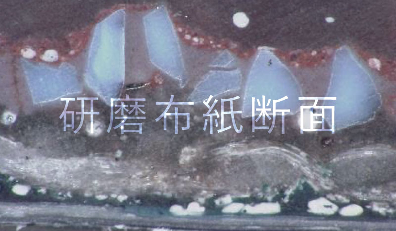 接着剤とは、研磨布紙における基材と砥材を接着させる役目を持った素材です。砥材の脱粒を防ぐために下引き接着剤と上引き接着剤の二度に分けて接着剤を塗布します。